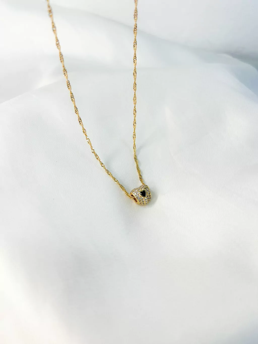 Colar com pingente separador redondo cravejado com micro zircônia cristal e detalhe em coração zircônia preta;